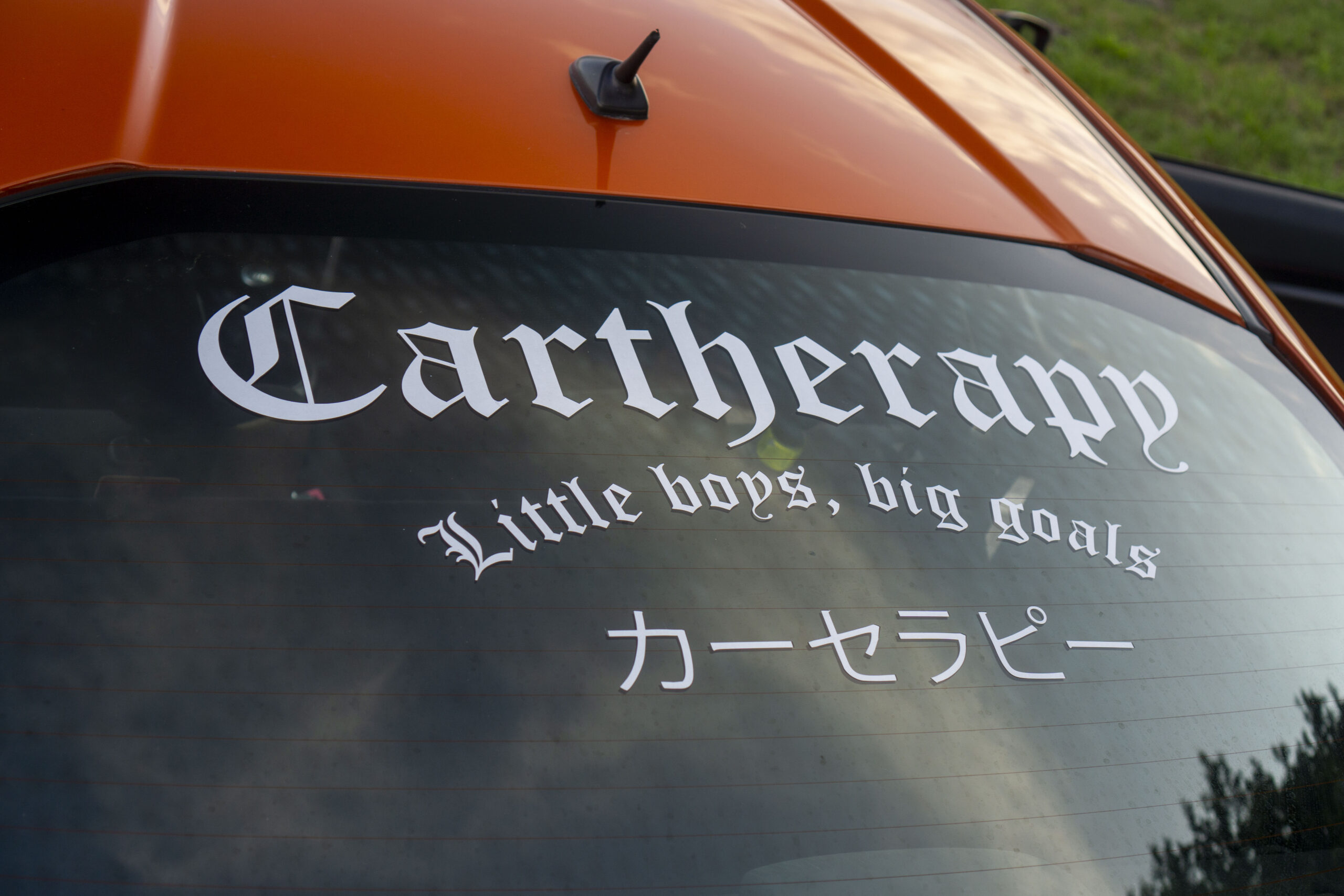 Baner na szybę tylną z logo Cartherapy i sloganem w kolorze czarnym lub białym.